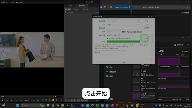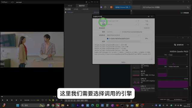 模型下载完之后,就开始自动生成字幕信息了,我这个视频长度是一分钟,20 多秒就生成了字幕信息,速度还是挺快的。我的电脑配有一块英伟达 P620 独立显卡,我再选择 cuda 这个引擎,然后 medium 模型试一试,这个耗时就比较久,大概要六七分钟了,但给我的感觉是从 tiny 到 large,同样硬件的情况下,耗时是递增的,生成的字幕质量也是越来越好的。可以根据自己的硬件配置,选择合适的引擎和模型,从而获得最佳的结果。