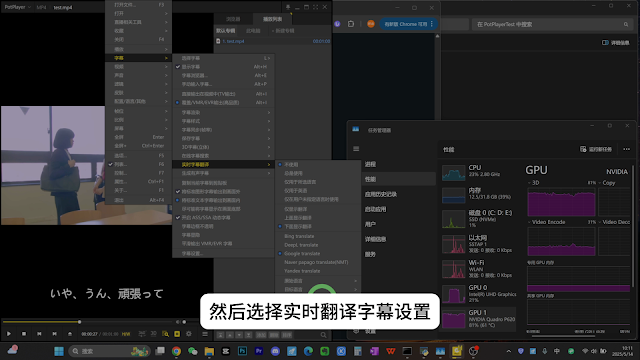 第二步,把字幕转换成中文,在视频画面点击鼠标右键,选择实时字幕翻译,然后选择实时字幕翻译设置,使用条件选择总是使用,翻译位置也可以选择显示在原字幕的上方或者下方都可以,这样中文和日文同时显示,比较有利于我们学习外语。翻译引擎我建议大家选择 Google,然后点击测试,这个窗口代表测试成功,然后点击确定